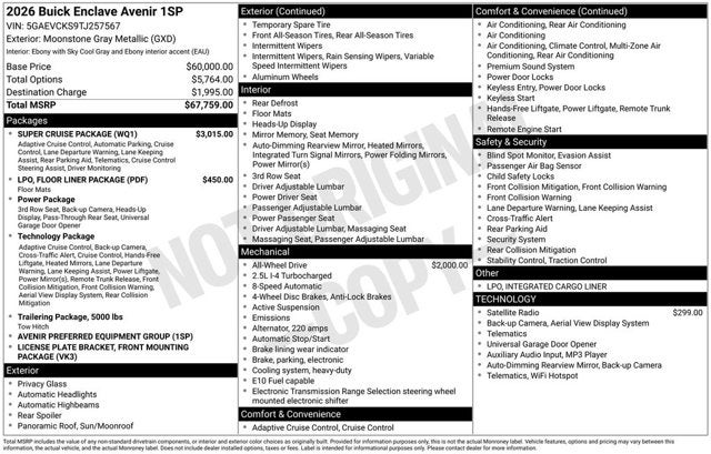 Price includes: $250 - Buick GMC Bonus Cash. Exp. 03/31/2026 $500 - Buick & GMC Consumer Cash Program. Exp. 03/31/2026 Please call for more information. If you don't see the car of your dreams in our huge inventory, chances are we can get it for you! 16 Speakers, 1st and 2nd Row All-Weather Floor Liners, 3 Years SiriusXM, 3rd Row All-Weather Floor Liner, 3rd row seats: split-bench, 4-Wheel Disc Brakes, ABS brakes, Adaptive suspension, Air Conditioning, Alloy wheels, AM/FM radio: SiriusXM with 360L, Apple CarPlay/Android Auto, Auto High-beam Headlights, Auto tilt-away steering wheel, Auto-dimming door mirrors, Auto-dimming Rear-View mirror, Automatic temperature control, Bose Performance 16-Speaker Audio System with Subwoofer, Brake assist, Bumpers: body-color, Compass, Delay-off headlights, Driver 4-Way Power Lumbar Seat Adjuster, Driver 8-Way Power Seat Adjuster, Driver Attention Assist, Driver door bin, Driver Massage Control with 4-Way Power Lumbar, Driver vanity mirror, Dual front impact airbags, Dual front side impact airbags, Electronic Stability Control, Emergency communication system: OnStar and Buick connected services capable, Enhanced Automatic Parking Assist, Floor Liner Package, Four wheel independent suspension, Front anti-roll bar, Front Bucket Seats, Front Center Armrest, Front dual zone A/C, Front Mounting License Plate Bracket Package, Front Passenger 4-Way Power Lumbar Seat Adjuster, Front Passenger 6-Way Power Seat Adjuster, Front Passenger Massage Control with 4-Way Power Lumbar, Front reading lights, Fully automatic headlights, Garage door transmitter, Heads-Up Display, Heated door mirrors, Heated Driver and Front Passenger Seats, Heated front seats, Heated rear seats, Heated steering wheel, Illuminated entry, Integrated Cargo Liner, Leather steering wheel, Low tire pressure warning, Memory seat, Memory Settings, Navigation System, Occupant sensing airbag, Outside temperature display, Overhead airbag, Overhead console, Panic alarm, Passenger door bin, Passenger vanity mirror, Power door mirrors, Power driver seat, Power Liftgate, Power moonroof, Power passenger seat, Power steering, Power windows, Preferred Equipment Group 1SP, Premium audio system: Buick Infotainment System, Quilted and Perforated Leather-Appointed Seat Trim, Radio data system, Radio: Infotainment Center, Rain sensing wipers, Rear air conditioning, Rear anti-roll bar, Rear reading lights, Rear side impact airbag, Rear window defroster, Rear window wiper, Remote keyless entry, Security system, SiriusXM with 360L Trial Subscription, Speed control, Speed-sensing steering, Spoiler, Steering wheel memory, Steering wheel mounted audio controls, Super Cruise, Super Cruise Package, Tachometer, Telescoping steering wheel, Tilt steering wheel, Traction control, Trip computer, Turn signal indicator mirrors, Variably intermittent wipers, Ventilated Driver and Front Passenger Seats, Ventilated front seats, Ventilated rear seats, Voltmeter, Wheels: 22 Alloy with Avenir Pearl Nickel Finish, Wireless Apple CarPlay, Wireless Google Android Auto.